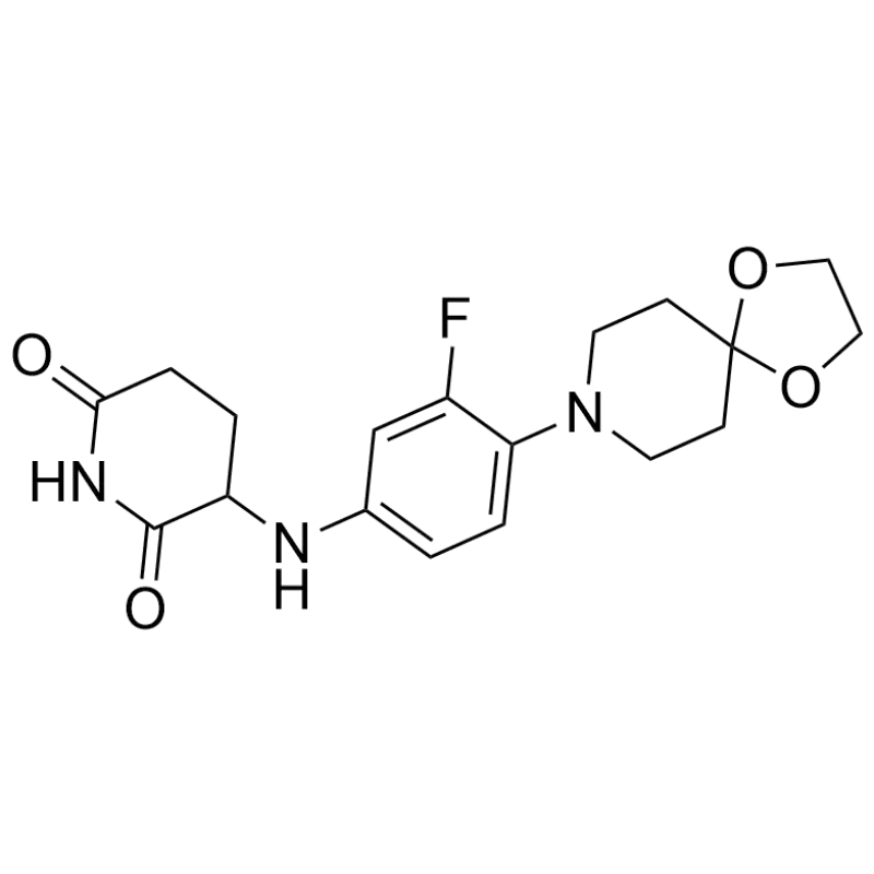 • SMILES: FC1=CC(NC(C(N2)=O)CCC2=O)=CC=C1N3CCC4(OCCO4)CC3
