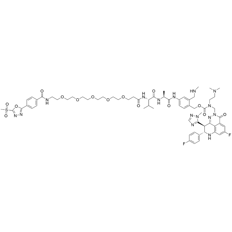 • SMILES: C[C@@H](C(NC1=CC=C(C(CNC)=C1)COC(N(CCN(C)C)CN2N=C3[C@H](C4=NC=NN4C)[C@@H](C5=CC=C(C=C5)F)NC6=C3C(C2=O)=CC(F)=C6)=O)=O)NC([C@H](C(C)C)NC(CCOCCOCCOCCOCCOCCNC(C7=CC=C(C8=NN=C(S(=O)(C)=O)O8)C=C7)=O)=O)=O