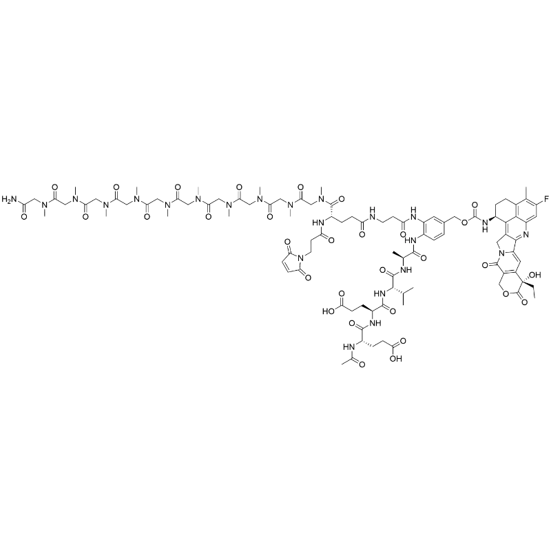 - SMILES: O=C(N[C@H]1CCC2=C(C1=C(CN3C4=CC5=C(COC([C@@]5(CC)O)=O)C3=O)C4=N6)C6=CC(F)=C2C)OCC(C=C7)=CC(NC(CCNC(CC[C@@H](C(N(C)CC(N(C)CC(N(C)CC(N(C)CC(N(C)CC(N(C)CC(N(C)CC(N(C)CC(N(C)CC(N(C)CC(N)=O)=O)=O)=O)=O)=O)=O)=O)=O)=O)=O)NC(CCN8C(C=CC8=O)=O)=O)=O)=O)=C7NC([C@H](C)NC([C@H](C(C)C)NC([C@@H](NC([C@@H](NC(C)=O)CCC(O)=O)=O)CCC(O)=O)=O)=O)=O