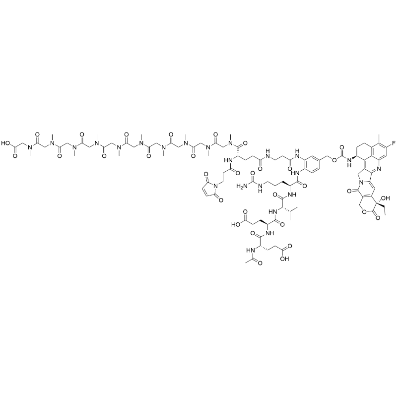 - SMILES: O=C(N[C@H]1CCC2=C(C1=C(CN3C4=CC5=C(COC([C@@]5(CC)O)=O)C3=O)C4=N6)C6=CC(F)=C2C)OCC(C=C7)=CC(NC(CCNC(CC[C@@H](C(N(C)CC(N(C)CC(N(C)CC(N(C)CC(N(C)CC(N(C)CC(N(C)CC(N(C)CC(N(C)CC(N(C)CC(O)=O)=O)=O)=O)=O)=O)=O)=O)=O)=O)=O)NC(CCN8C(C=CC8=O)=O)=O)=O)=O)=C7NC([C@H](CCCNC(N)=O)NC([C@H](C(C)C)NC([C@@H](NC([C@@H](NC(C)=O)CCC(O)=O)=O)CCC(O)=O)=O)=O)=O
