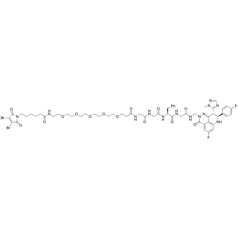 - SMILES: O=C(NCN1N=C2[C@H](C3=NC=NN3C)[C@@H](C4=CC=C(C=C4)F)NC5=C2C(C1=O)=CC(F)=C5)CNC([C@H](CC6=CC=CC=C6)NC(CNC(CNC(CCOCCOCCOCCOCCOCCNC(CCCCCN7C(C(Br)=C(Br)C7=O)=O)=O)=O)=O)=O)=O