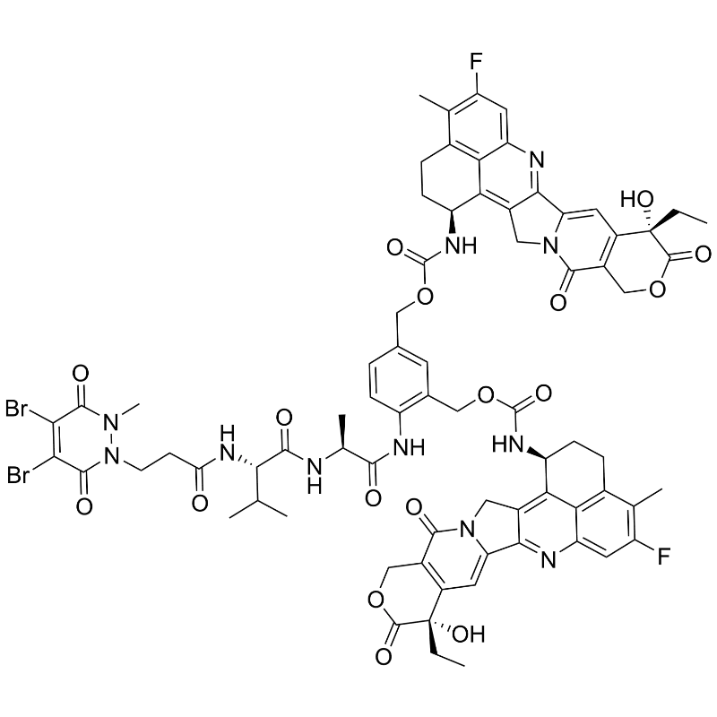 - SMILES: CC(C)[C@H](NC(=O)CCN1C(=O)C(Br)=C(Br)C(=O)N1C)C(=O)N[C@@H](C)C(NC1C=CC(COC(=O)N[C@@H]2C3=C4CN5C(=O)C6COC(=O)[C@@](CC)(O)C=6C=C5C4=NC4C3=C(CC2)C(C)=C(F)C=4)=CC=1COC(=O)N[C@@H]1C2=C3CN4C(=O)C5COC(=O)[C@@](CC)(O)C=5C=C4C3=NC3C2=C(CC1)C(C)=C(F)C=3)=O