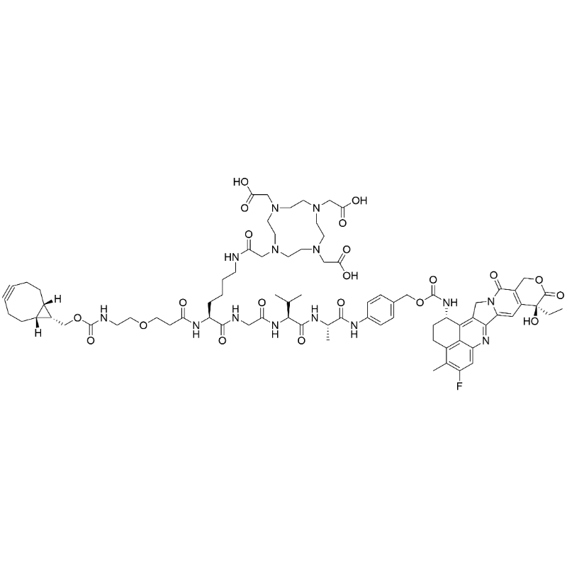 - SMILES: O=C(CCOCCNC(OC[C@@H]1[C@@]2([H])[C@]1([H])CCC#CCC2)=O)N[C@@H](CCCCNC(CN(CC3)CCN(CC(O)=O)CCN(CC(O)=O)CCN3CC(O)=O)=O)C(NCC(N[C@@H](C(C)C)C(N[C@@H](C)C(NC4=CC=C(COC(N[C@H]5CCC6=C(C5=C(CN7C8=CC9=C(COC([C@@]9(CC)O)=O)C7=O)C8=N%10)C%10=CC(F)=C6C)=O)C=C4)=O)=O)=O)=O