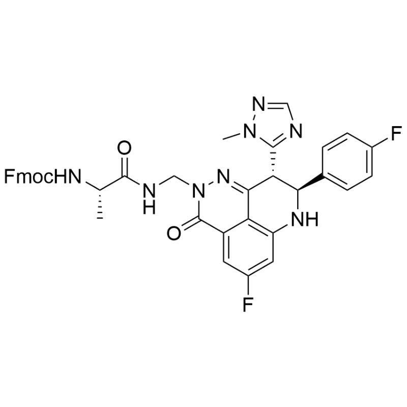 - SMILES: O=C(NCN1N=C2[C@H](C3=NC=NN3C)[C@@H](C4=CC=C(C=C4)F)NC5=C2C(C1=O)=CC(F)=C5)[C@H](C)NC(OCC6C(C=CC=C7)=C7C8=C6C=CC=C8)=O