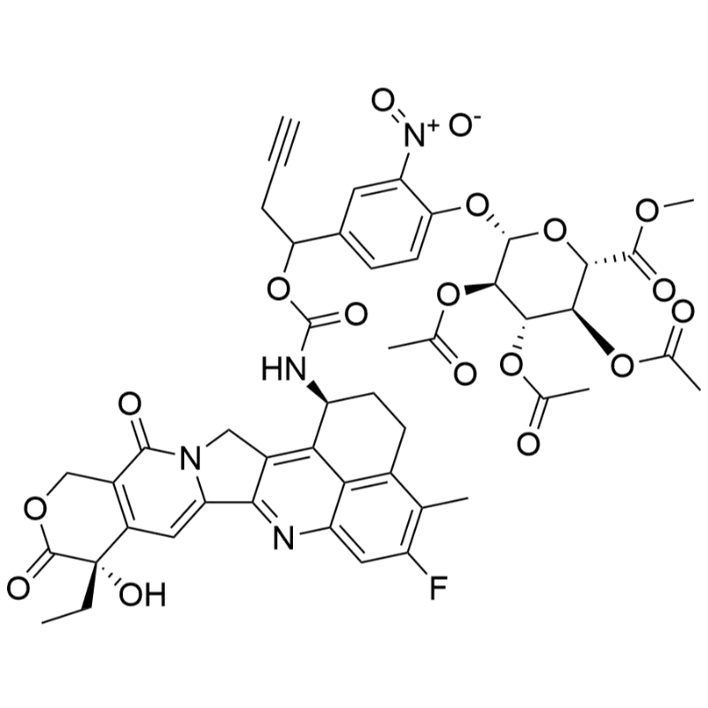 - SMILES: C#CCC(C1=CC=C(O[C@H]2[C@H](OC(C)=O)[C@@H](OC(C)=O)[C@H](OC(C)=O)[C@@H](C(OC)=O)O2)C([N+]([O-])=O)=C1)OC(N[C@H]3CCC4=C5C3=C(C6=NC5=CC(F)=C4C)CN7C6=CC8=C(C7=O)COC([C@]8(O)CC)=O)=O