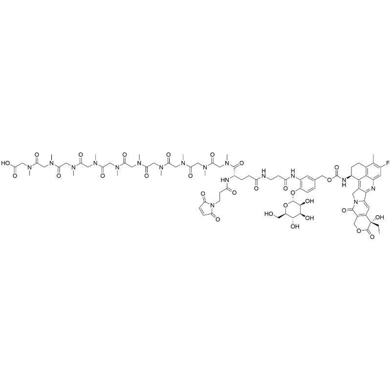 - SMILES: O=C(N[C@H]1CCC2=C(C1=C(CN3C4=CC5=C(COC([C@@]5(CC)O)=O)C3=O)C4=N6)C6=CC(F)=C2C)OCC7=CC(NC(CCNC(CC[C@@H](C(N(C)CC(N(C)CC(N(C)CC(N(C)CC(N(C)CC(N(C)CC(N(C)CC(N(C)CC(N(C)CC(N(C)CC(O)=O)=O)=O)=O)=O)=O)=O)=O)=O)=O)=O)NC(CCN8C(C=CC8=O)=O)=O)=O)=O)=C(O[C@@H]9[C@@H](O)[C@H]([C@@H]([C@H](O9)CO)O)O)C=C7