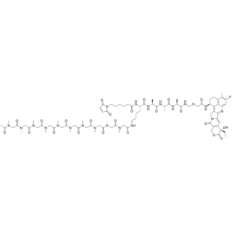 - SMILES: C[C@@H](C(N[C@H](C(N[C@@H](C)C(NCOCC(N[C@H]1CCC2=C(C1=C(CN3C4=CC5=C(COC([C@@]5(CC)O)=O)C3=O)C4=N6)C6=CC(F)=C2C)=O)=O)=O)C)=O)NC([C@H](CCCCNC(CN(C)C(CN(C)C(CN(C)C(CN(C)C(CN(C)C(CN(C)C(CN(C)C(CN(C)C(CN(C)C(CN(C)C(C)=O)=O)=O)=O)=O)=O)=O)=O)=O)=O)=O)NC(CCCCCN7C(C=CC7=O)=O)=O)=O