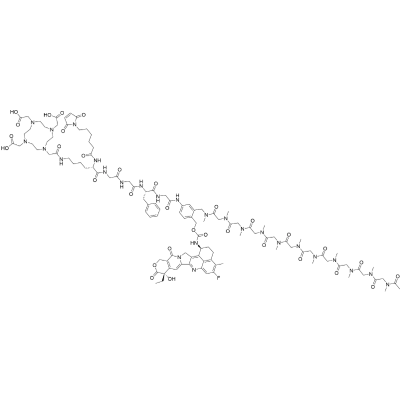 - SMILES: O=C(CNC([C@H](CCCCNC(CN(CC1)CCN(CC(O)=O)CCN(CC(O)=O)CCN1CC(O)=O)=O)NC(CCCCCN2C(C=CC2=O)=O)=O)=O)NCC(N[C@@H](CC3=CC=CC=C3)C(NCC(NC4=CC=C(COC(N[C@H]5CCC6=C(C5=C(CN7C8=CC9=C(COC([C@@]9(CC)O)=O)C7=O)C8=N%10)C%10=CC(F)=C6C)=O)C(CN(C(CN(C)C(CN(C)C(CN(C)C(CN(C)C(CN(C)C(CN(C)C(CN(C)C(CN(C)C(CN(C)C(CN(C)C(C)=O)=O)=O)=O)=O)=O)=O)=O)=O)=O)=O)C)=C4)=O)=O)=O