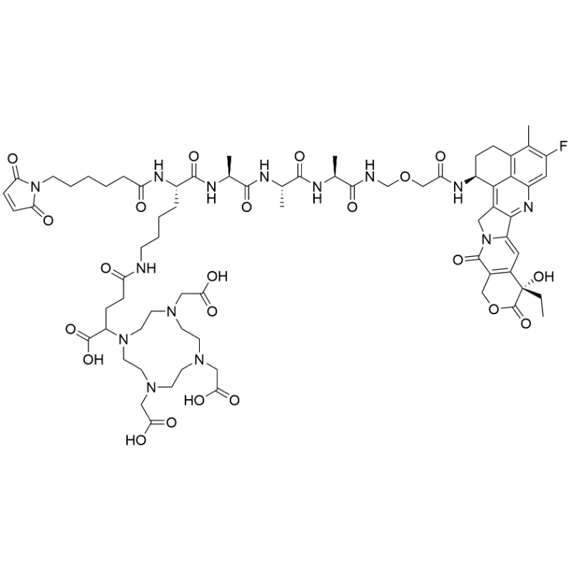 - SMILES: C[C@@H](C(N[C@H](C(N[C@@H](C)C(NCOCC(N[C@H]1CCC2=C(C1=C(CN3C4=CC5=C(COC([C@@]5(CC)O)=O)C3=O)C4=N6)C6=CC(F)=C2C)=O)=O)=O)C)=O)NC([C@H](CCCCNC(CCC(C(O)=O)N(CCN(CC7)CC(O)=O)CCN(CC(O)=O)CCN7CC(O)=O)=O)NC(CCCCCN8C(C=CC8=O)=O)=O)=O