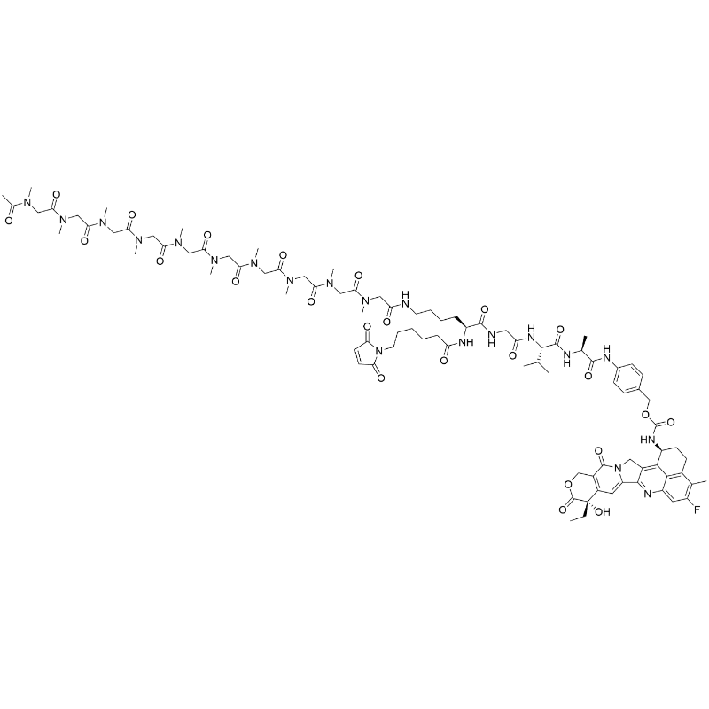 - SMILES: O=C1C=CC(N1CCCCCC(N[C@@H](CCCCNC(CN(C)C(CN(C)C(CN(C)C(CN(C)C(CN(C)C(CN(C)C(CN(C)C(CN(C)C(CN(C)C(CN(C)C(C)=O)=O)=O)=O)=O)=O)=O)=O)=O)=O)=O)C(NCC(N[C@@H](C(C)C)C(N[C@@H](C)C(NC2=CC=C(COC(N[C@H]3CCC4=C(C3=C(CN5C6=CC7=C(COC([C@@]7(CC)O)=O)C5=O)C6=N8)C8=CC(F)=C4C)=O)C=C2)=O)=O)=O)=O)=O)=O