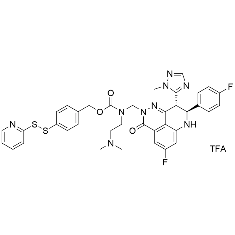 - SMILES: O=C(OCC1=CC=C(SSC2=NC=CC=C2)C=C1)N(CCN(C)C)CN(N=C3C4=C5C=C(F)C=C4N[C@H](C6=CC=C(F)C=C6)[C@H]3C7=NC=NN7C)C5=O.O=CC(F)(F)F