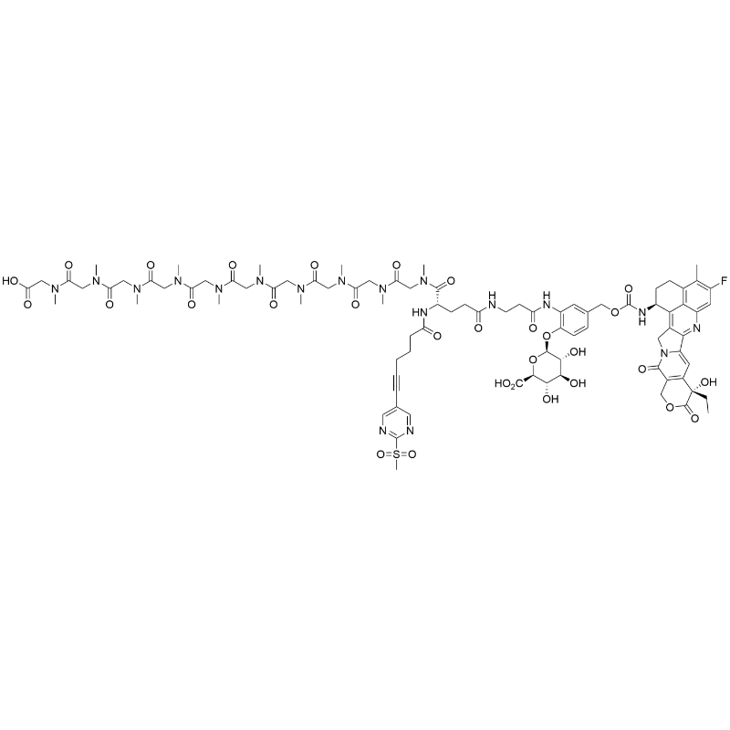 - SMILES: O=C(N[C@H]1CCC2=C(C1=C(CN3C4=CC5=C(COC([C@@]5(CC)O)=O)C3=O)C4=N6)C6=CC(F)=C2C)OCC(C=C7)=CC(NC(CCNC(CC[C@@H](C(N(C)CC(N(C)CC(N(C)CC(N(C)CC(N(C)CC(N(C)CC(N(C)CC(N(C)CC(N(C)CC(N(C)CC(O)=O)=O)=O)=O)=O)=O)=O)=O)=O)=O)=O)NC(CCCC#CC(C=N8)=CN=C8S(C)(=O)=O)=O)=O)=O)=C7O[C@@H]9O[C@H](C(O)=O)[C@@H](O)[C@H](O)[C@H]9O