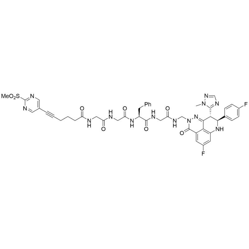 • SMILES: O=C(NCN1N=C2[C@H](C3=NC=NN3C)[C@@H](C4=CC=C(C=C4)F)NC5=C2C(C1=O)=CC(F)=C5)CNC([C@H](CC6=CC=CC=C6)NC(CNC(CNC(CCCC#CC7=CN=C(S(=O)(C)=O)N=C7)=O)=O)=O)=O