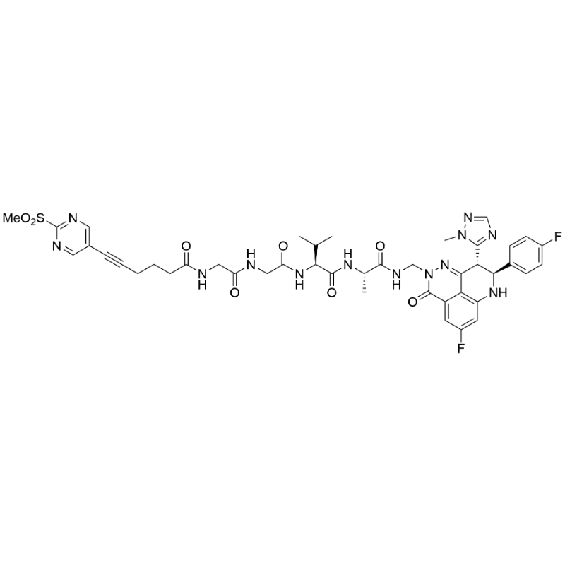 - SMILES: O=C(NCN1N=C2[C@H](C3=NC=NN3C)[C@@H](C4=CC=C(C=C4)F)NC5=C2C(C1=O)=CC(F)=C5)[C@H](C)NC([C@H](C(C)C)NC(CNC(CNC(CCCC#CC6=CN=C(S(=O)(C)=O)N=C6)=O)=O)=O)=O