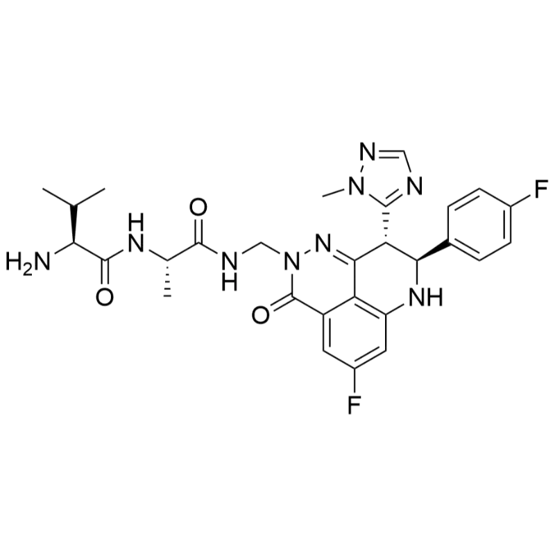 • SMILES: O=C([C@@H](NC([C@@H](N)C(C)C)=O)C)NCN1N=C2[C@@H]([C@H](NC3=C2C(C1=O)=CC(F)=C3)C4=CC=C(F)C=C4)C5=NC=NN5C