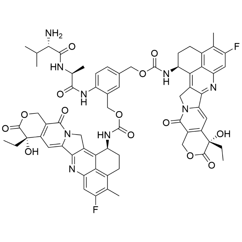 - SMILES: CC(C)[C@H](N)C(N[C@@H](C)C(NC1=CC=C(COC(N[C@H]2CCC3=C(C2=C(CN4C5=CC6=C(COC([C@@]6(CC)O)=O)C4=O)C5=N7)C7=CC(F)=C3C)=O)C=C1COC(N[C@H]8CCC9=C(C8=C(CN%10C%11=CC%12=C(COC([C@@]%12(CC)O)=O)C%10=O)C%11=N%13)C%13=CC(F)=C9C)=O)=O)=O
