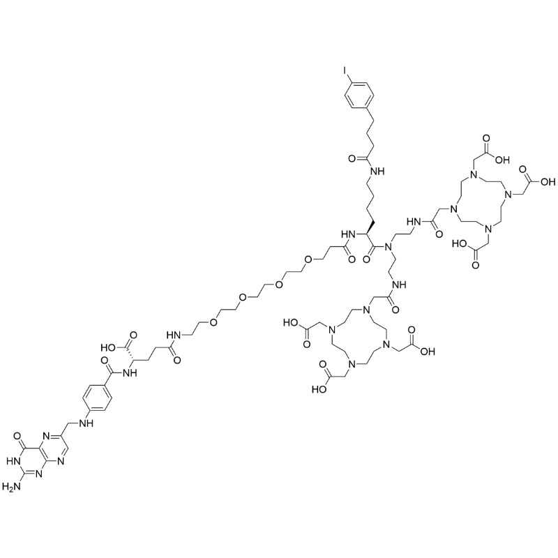 - SMILES: OC(CN(CC1)CCN(CC(O)=O)CCN(CC(O)=O)CCN1CC(NCCN(CCNC(CN2CCN(CC(O)=O)CCN(CC(O)=O)CCN(CC(O)=O)CC2)=O)C([C@@H](NC(CCOCCOCCOCCOCCNC(CC[C@H](NC(C3=CC=C(NCC4=NC5=C(N=C4)N=C(N)NC5=O)C=C3)=O)C(O)=O)=O)=O)CCCCNC(CCCC6=CC=C(I)C=C6)=O)=O)=O)=O