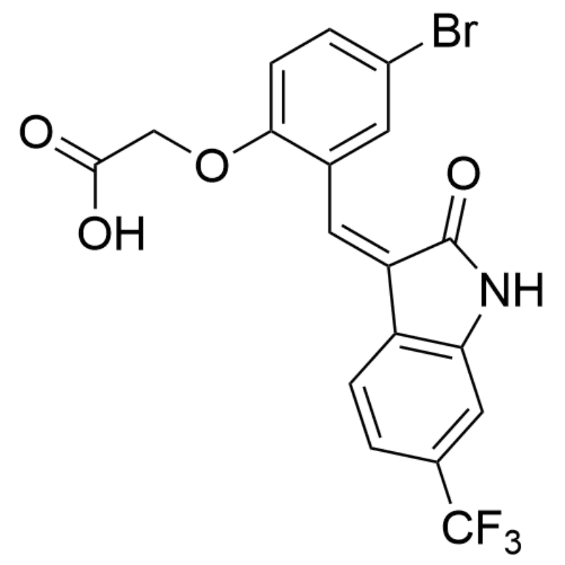 • SMILES: BrC1=CC=C(OCC(O)=O)C(/C=C2C(C=CC(C(F)(F)F)=C3)=C3NC/2=O)=C1