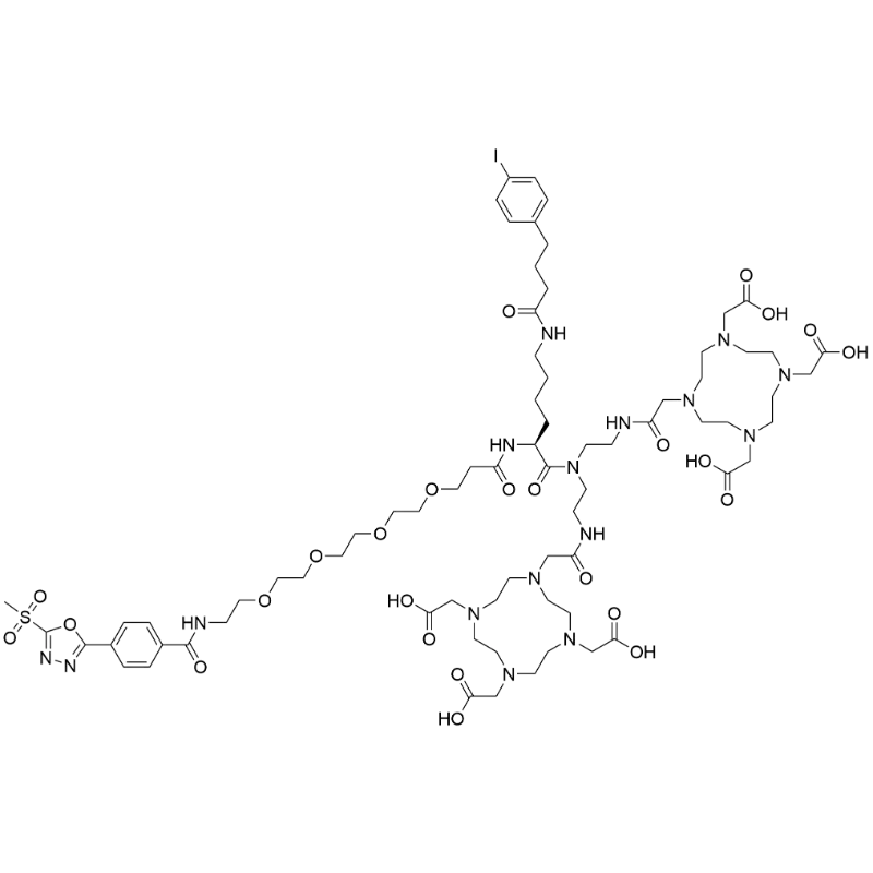 - SMILES: OC(CN(CC1)CCN(CC(O)=O)CCN(CC(O)=O)CCN1CC(NCCN(CCNC(CN2CCN(CC(O)=O)CCN(CC(O)=O)CCN(CC(O)=O)CC2)=O)C([C@@H](NC(CCOCCOCCOCCOCCNC(C3=CC=C(C4=NN=C(O4)S(C)(=O)=O)C=C3)=O)=O)CCCCNC(CCCC5=CC=C(I)C=C5)=O)=O)=O)=O